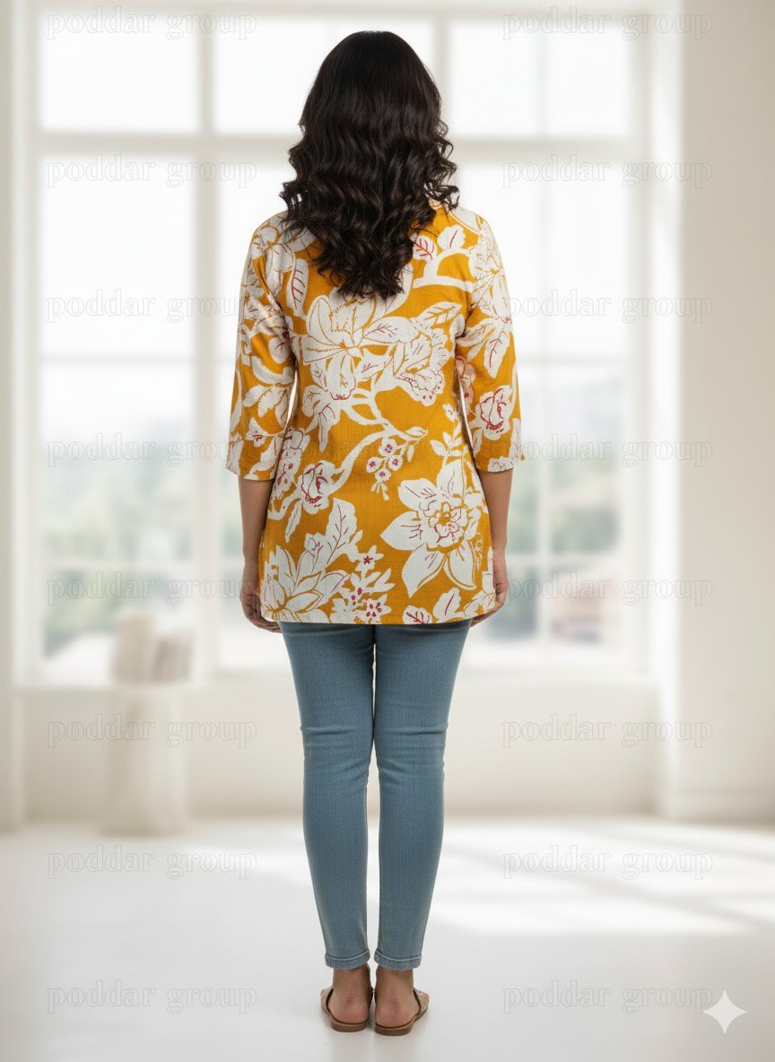 Make a bold statement with this vibrant mustard yellow tunic top. It features a striking all-over floral print in crisp white and hints of red, giving it a rich, warm aesthetic. The V-neckline is beautifully detailed with a vertical panel of intricate thread embroidery and subtle mirror or sequin work, adding a festive touch. With three-quarter sleeves and a comfortable, relaxed fit, this versatile top is perfect for daily wear, pairing effortlessly with jeans, white leggings, or trousers for a cheerful, ethnic-chic look.