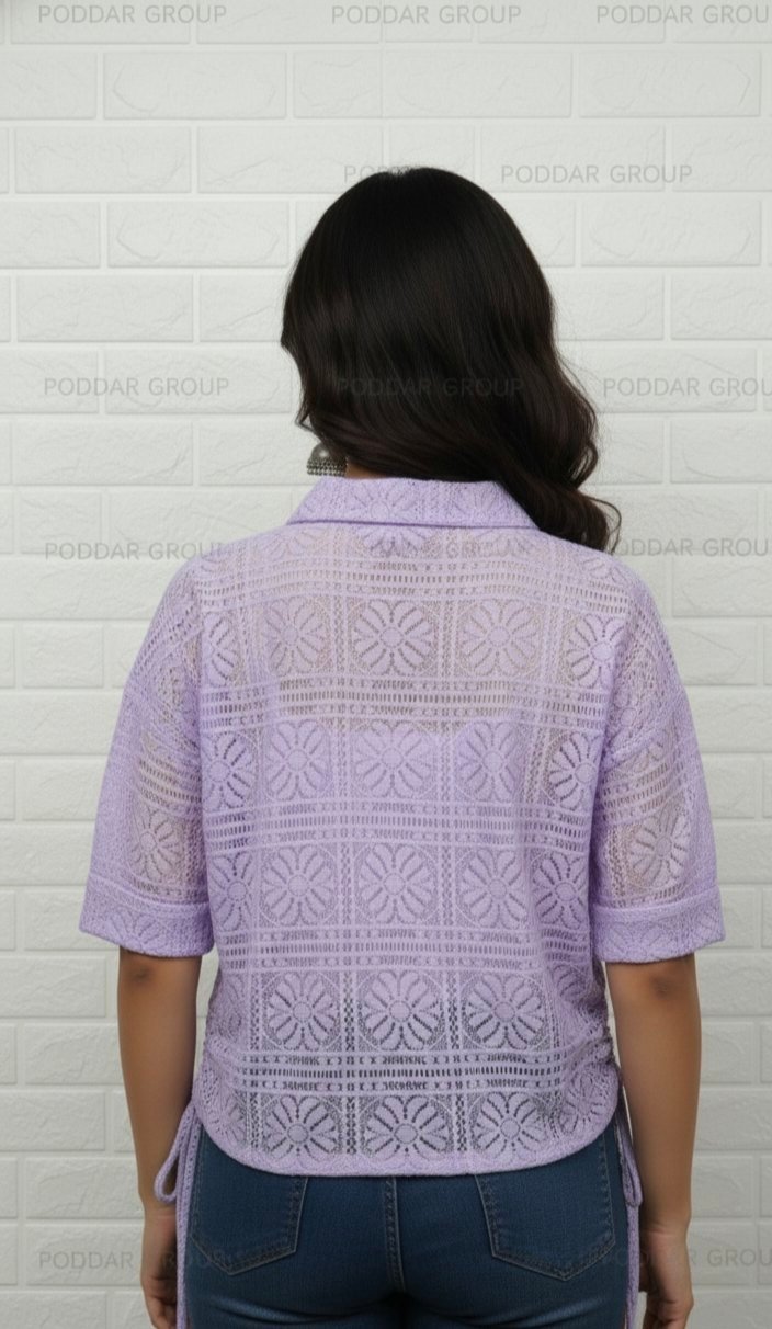 Make a fashionable statement in this trendy lilac (light purple) crochet lace top. It features a unique all-over patterned lace fabric that adds a delicate, sheer texture. The top is designed with a classic shirt collar and a full button-up front using contrasting buttons. A defining feature is the adjustable drawstring hem with side ties, allowing you to cinch the waist for a flattering, cropped silhouette. With short, elbow-length sleeves and a relaxed fit, this unique blouse pairs perfectly with jeans (as shown) or high-waisted trousers for a stylish, contemporary look.