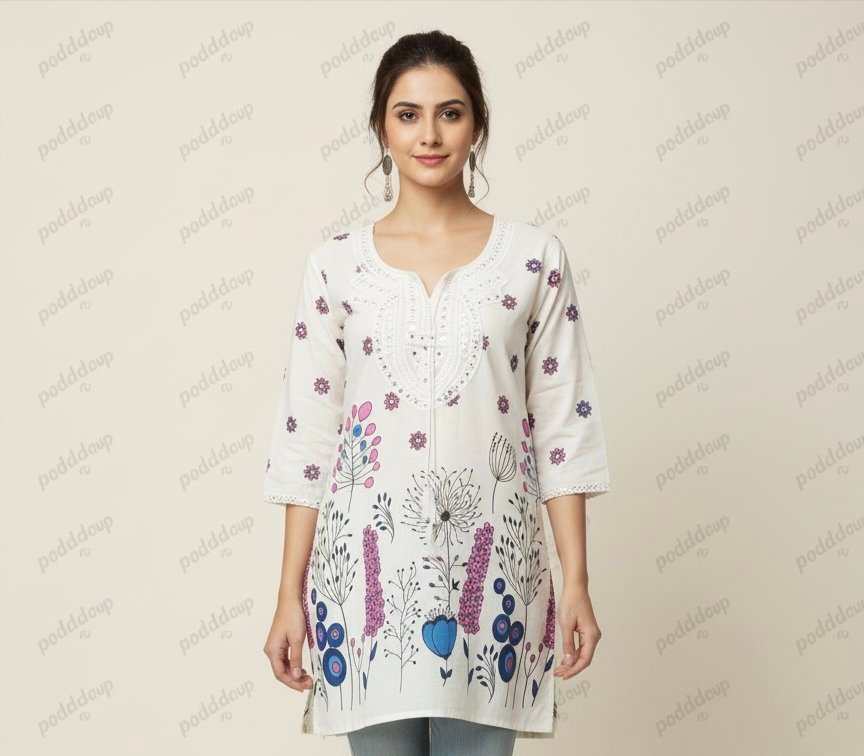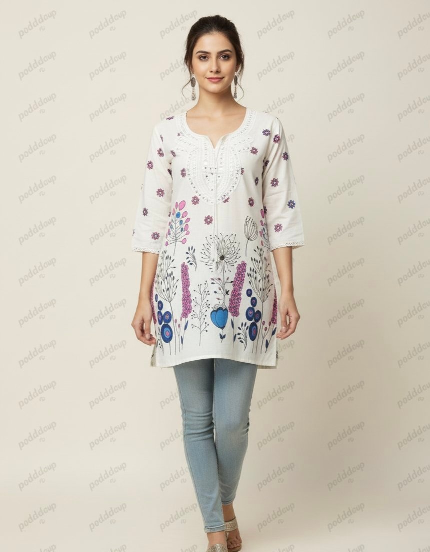 This charming white tunic top (kurti) offers a perfect blend of delicate and modern style. It features a delightful botanical print along the hemline with stylized florals and foliage in shades of purple, blue, and pink. The U-shaped neckline is beautifully detailed with intricate white embroidery or lace work, which adds a soft, traditional texture. With comfortable three-quarter sleeves finished with subtle lace, and a relaxed straight fit, this versatile top is ideal for pairing with jeans (as shown), leggings, or trousers for a fresh, ethnic-casual look.