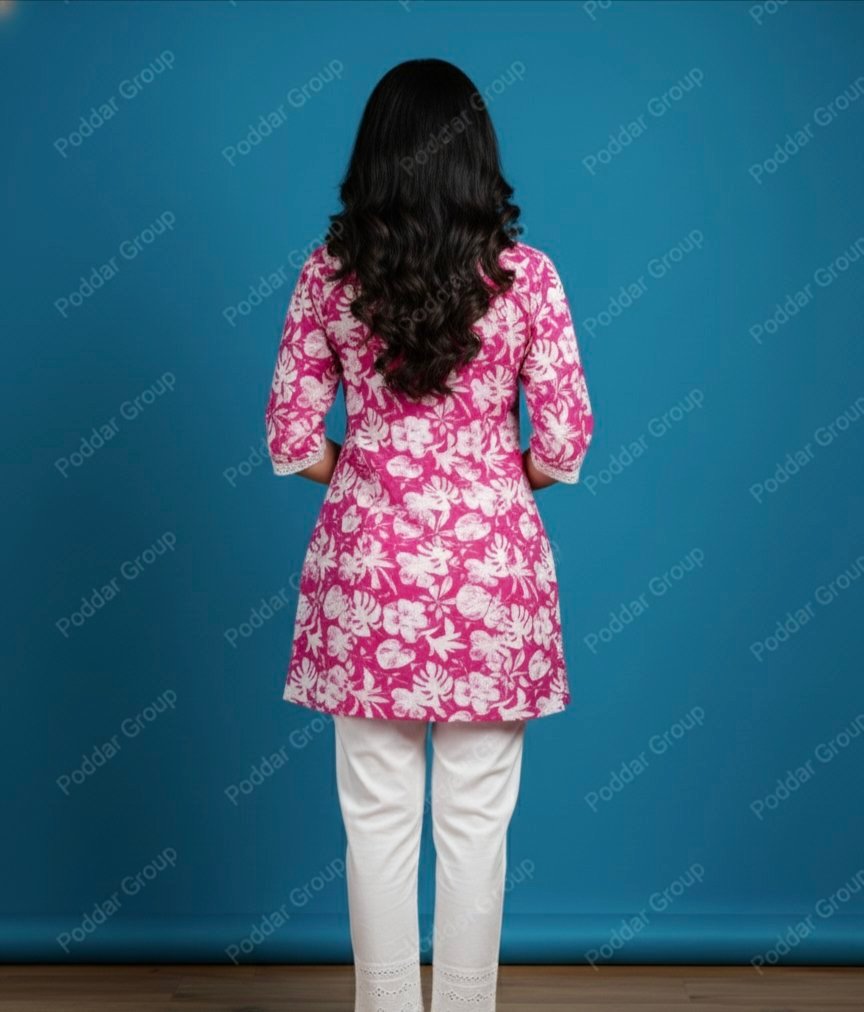 Make a dazzling statement with this vibrant magenta (hot pink) tunic top (kurti). It features a striking all-over white tropical floral and leaf print that creates an eye-catching contrast. The neckline is beautifully enhanced by an intricate white crochet or lace yoke which provides a rich, feminine texture. With comfortable three-quarter sleeves and a relaxed, straight fit, this versatile top is perfect for daily wear or casual gatherings, pairing effortlessly with white leggings, churidars, or jeans for an unforgettable look.